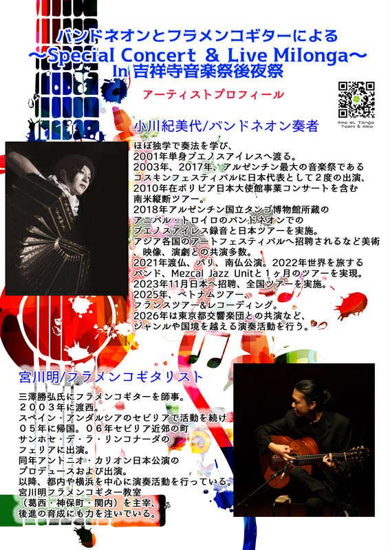 アルゼンチンの魂を宿すバンドネオンと、情熱あふれるフラメンコギター。タンゴを踊る方はもちろん、音楽をじっくり味わいたい方、フラメンコやワールドミュージックが好きな方にもぜひ体験していただきたいひと時です。