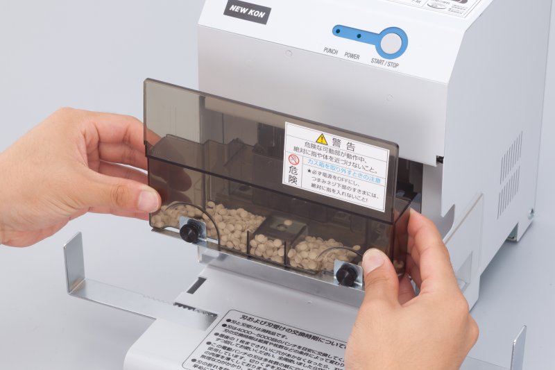 ①穿孔(穴あけ)した抜きカスが一目瞭然な半透明なカス箱