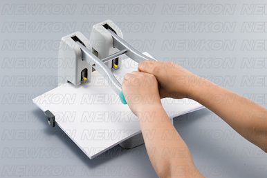 ハンドル操作により軽い力で一度にたくさんの枚数(最大穿孔能力が110枚の厚さ)の穴あけができるパンチです。