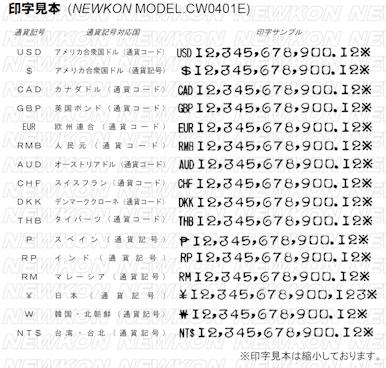 ドルとユーロに関しては、ISO4217通貨表示に対応したものを印字できますので、貿易業務・銀行取引業務でご利用いただけます。