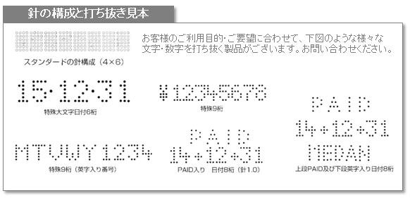 日付・番号・マーク・社名・コード・記号等を打ち抜いた穴文字は、何年経っても消えないので永久に保証・証明・確認、抹消などの役割を果たします。