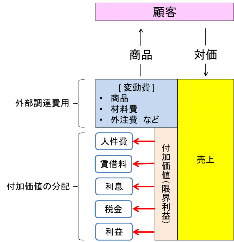 例えば、自社が商品を100円で仕入れて、それを顧客に120円で販売したとします。この場合、20円(120円-100円)が、自社が100円で仕入れた商品に加えた価値、つまり付加価値となります。