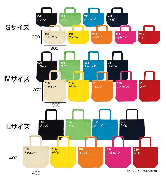 地球環境に優しい無漂白のトートバッグです。企業・イベントのノベルティに最適なトートバッグ。エコ素材使用でイメージアップに最適なアイテムです。S〜Lまで用途に合わせて3種類のサイズをご用意しました。プリントや刺繍が良く映える、飾り気のないシンプルなデザインなので、企業やイベントのロゴマーク、メッセージを効果的にアピールできます。価格もお求め安いので大量生産も安心。