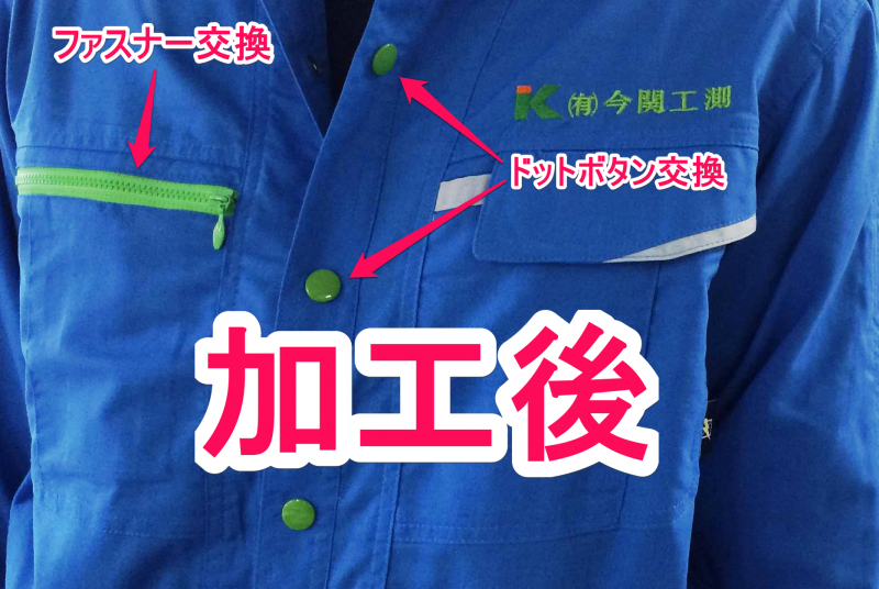 予算的に一気にワークウェアの刷新が難しい場合でも、この様なカスタム加工で見違える様になります。