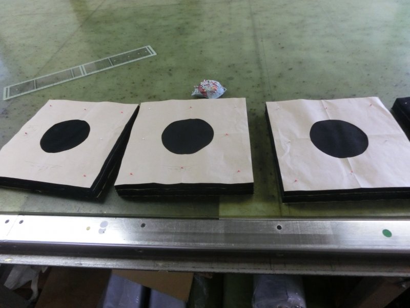 最近は自動裁断機が普及してきて大量生産の工場では当たり前になりつつありますが、生地の伸縮率を変えたくない場合や切り口を滑らかにしたい場合、小ロットの場合はこの様に人の手で裁断します。