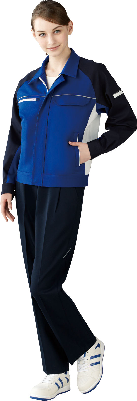 伸縮性に優れたストレッチ素材に防汚加工を施したソフトワーク向け男女ペアユニフォーム。