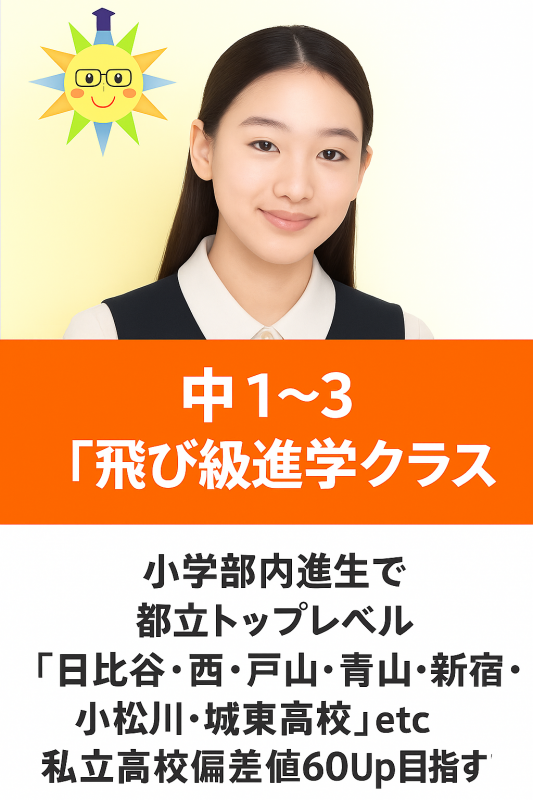 都立日比谷高校・西高校・戸山高校・青山高校・新宿高校・小山台高校・小松川高校・城東高校・竹早高校等々の都立トツプレベル及び私立高校偏差値65Upを目指すクラス。 -