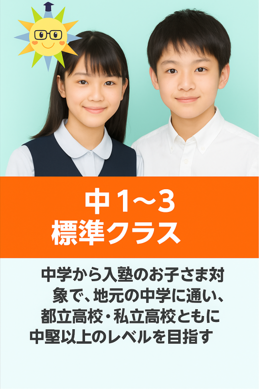 地元の公立中学進学希望者。学年に拘らず先取り学習も含め高校受験では都立トツプレベルの『日比谷高校・戸山高校・西高校・青山高校・新宿高校・小松川高校・小山台高校等々』や私立高校受験では偏差値60Upを目指します。 -