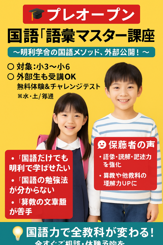 読書くらぶコ―スNeo(対象小3~4)小1~2の読書くらぶコ―ス(ことばの学校 読む解くメソッド(速聴・速読)+国語記述・語彙・読解力錬成)に【語彙マスター講座」を組込んでより強固な国語力Upを目指します。 中学受験3~6年生主体にオプション講座として指導し、確かな実積より新設します。受験するしないに関わらず学力の基礎基本はしつかりと身に付けます。