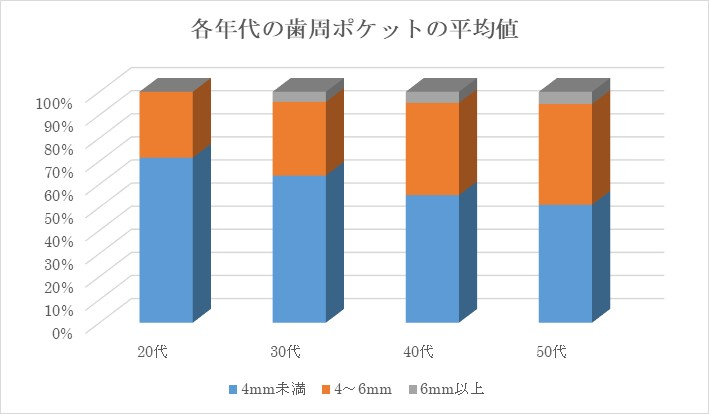 年齢が上がるにつれて「4~6mm」や「6mm以上」の割合が増加し、歯周ポケットの平均値は深くなる傾向が確認できます。