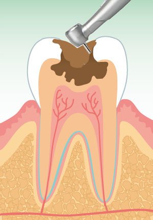 浸潤麻酔のもと、タービンやスプーンエキスカベーターで軟化象牙質を丁寧に取り除きます。