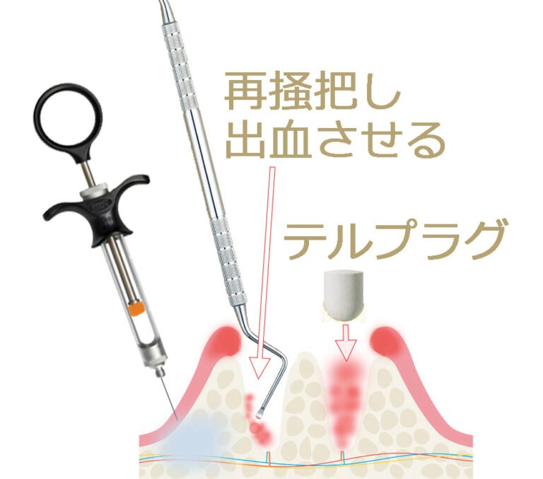スポンゼルやテルプラグ → 骨の露出部を保護し異物混入を防ぐ