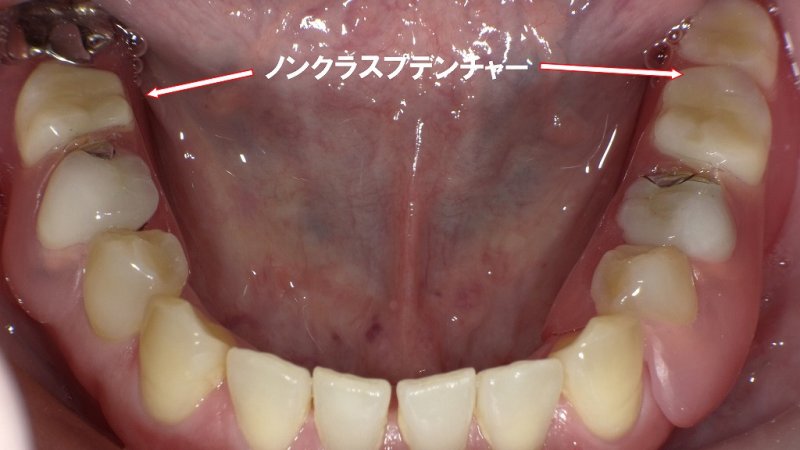 例えば、下顎大臼歯部に片側1歯、反対側2歯の欠損がある症例では、ノンクラスプデンチャーにより咬合支持を回復できます。